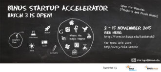 BINUS UNIVERSITY Proudly Presents : BINUS Startup Accelerator (Registration) November 02 - 15, 2015 (Monday - Sunday) Registration http://form.ict.binus.edu/bsabatch3 ...